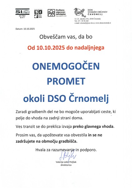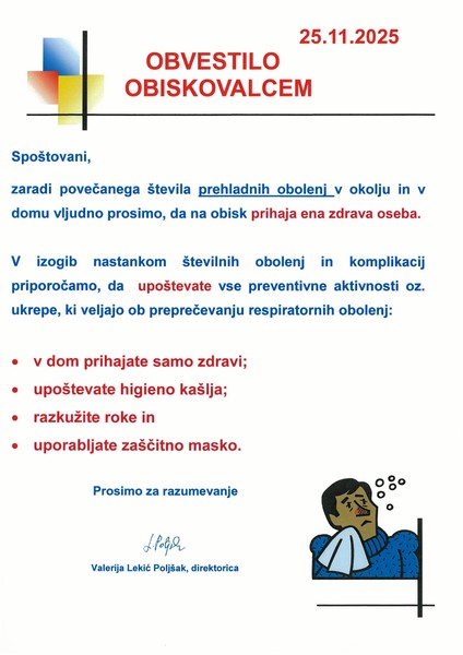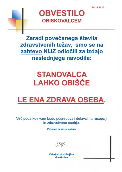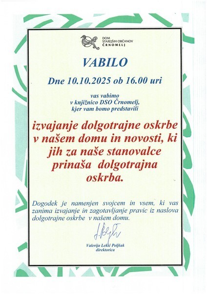 Vabim vas, da redno spremljate našo spletno in FB stran ter oglasne deske v domu, kjer vas bomo obveščali o vseh spremembah, vezanih na prehod na nov sistem dolgotrajne oskrbe.